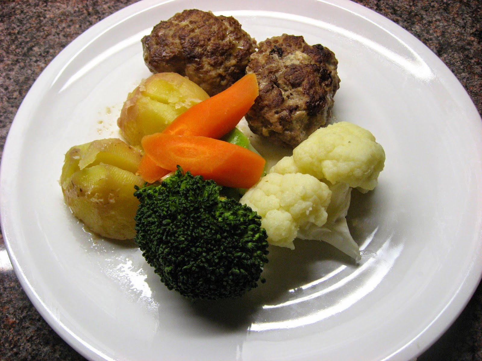 Tilbehøret denne gangen er poteter, gulrøtter (medium i salisyl), brokkoli og blomkål (begge høy i salisyl). Gammeldagse hvite poteter er lav i salisyl. Litt smør uten melk er godt å ha over retten.